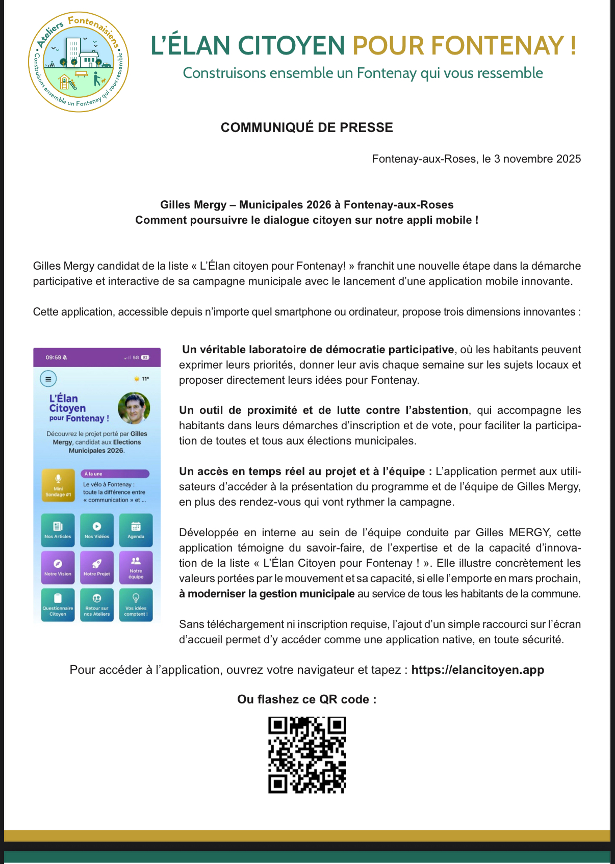 Communiqué de presse de la liste « L’élan citoyen pour Fontenay ! » : Comment poursuivre le dialogue citoyen sur notre appli mobile !