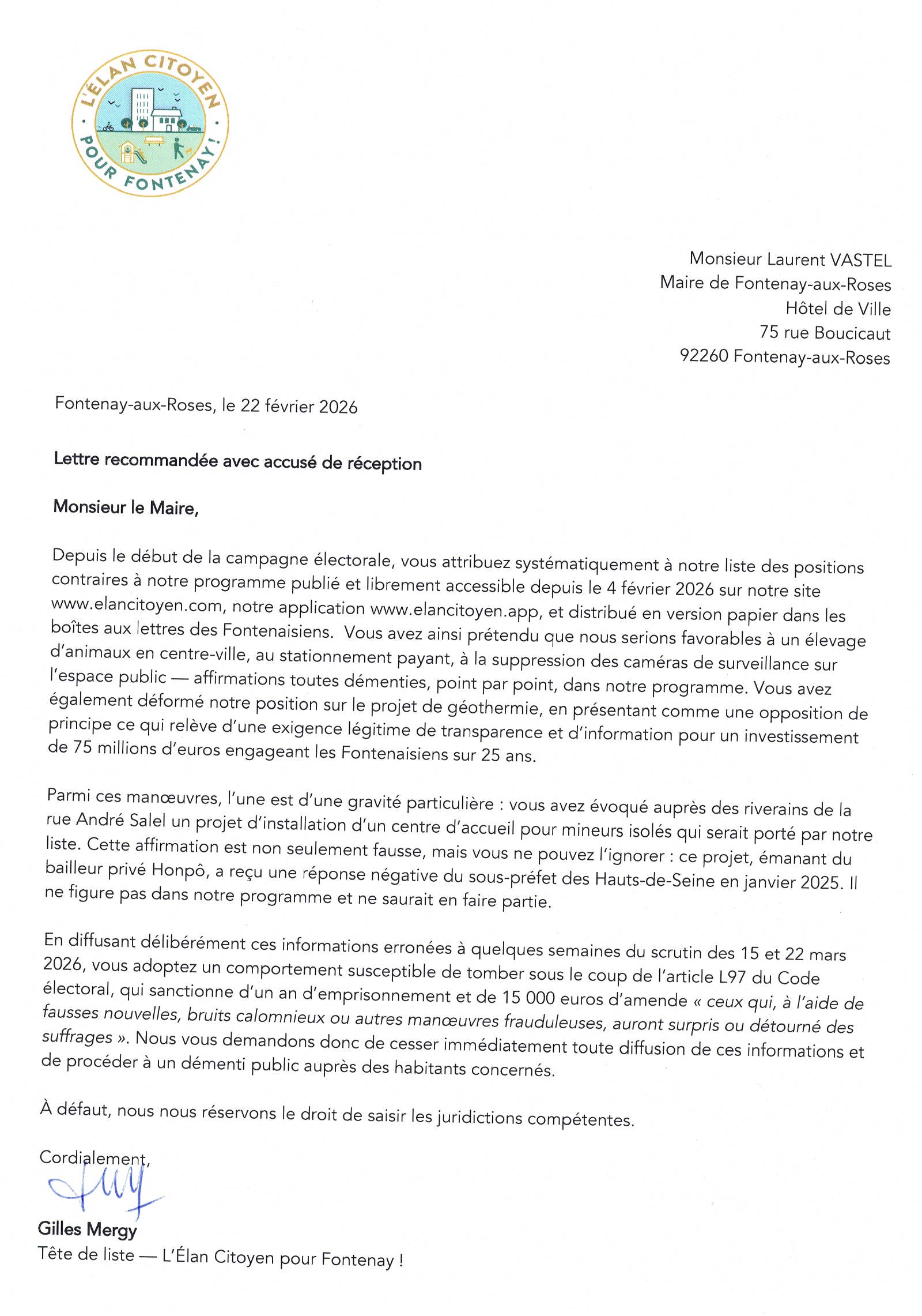 Contre-vérités permanentes du Maire actuel et de son équipe : copie de notre lettre recommandée