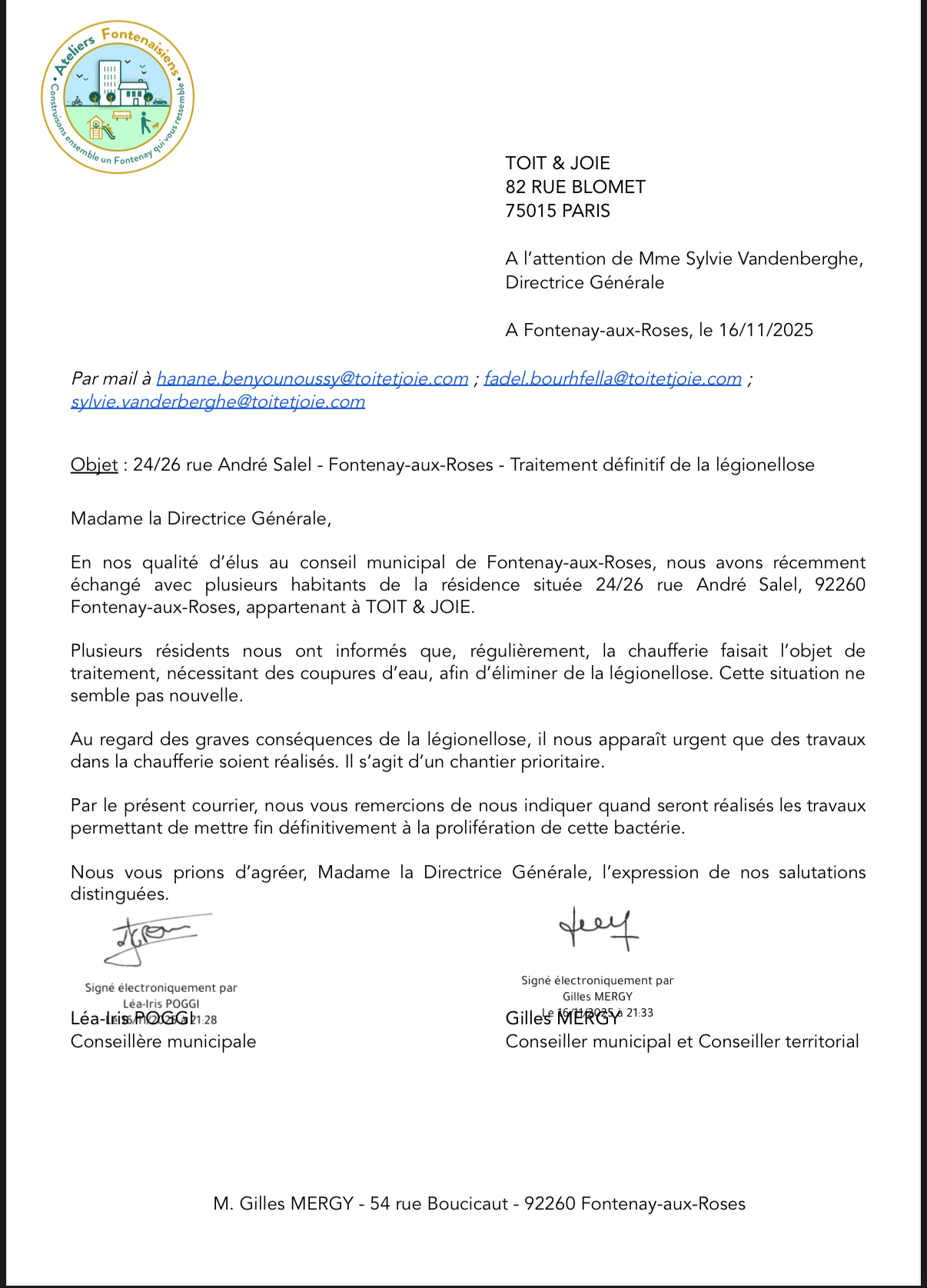 Suite à plusieurs alertes de la part des locataires de la résidence Toit et Joie de la rue André Salel, nous avons écrit le 16 novembre dernier à la Directrice générale pour lui demander de réaliser rapidement des travaux sur la chaufferie afin de mettre fin à la prolifération de la légionellose.