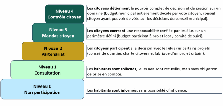 Notre objectif pour 2026 : atteindre les niveaux 2 et 3 (démocratie participative réelle). Au niveau 2, les citoyens participent à la décision avec les élus (partenariat). Au niveau 3, ils exercent une responsabilité qui leur est confiée sur un périmètre défini (mandat citoyen).