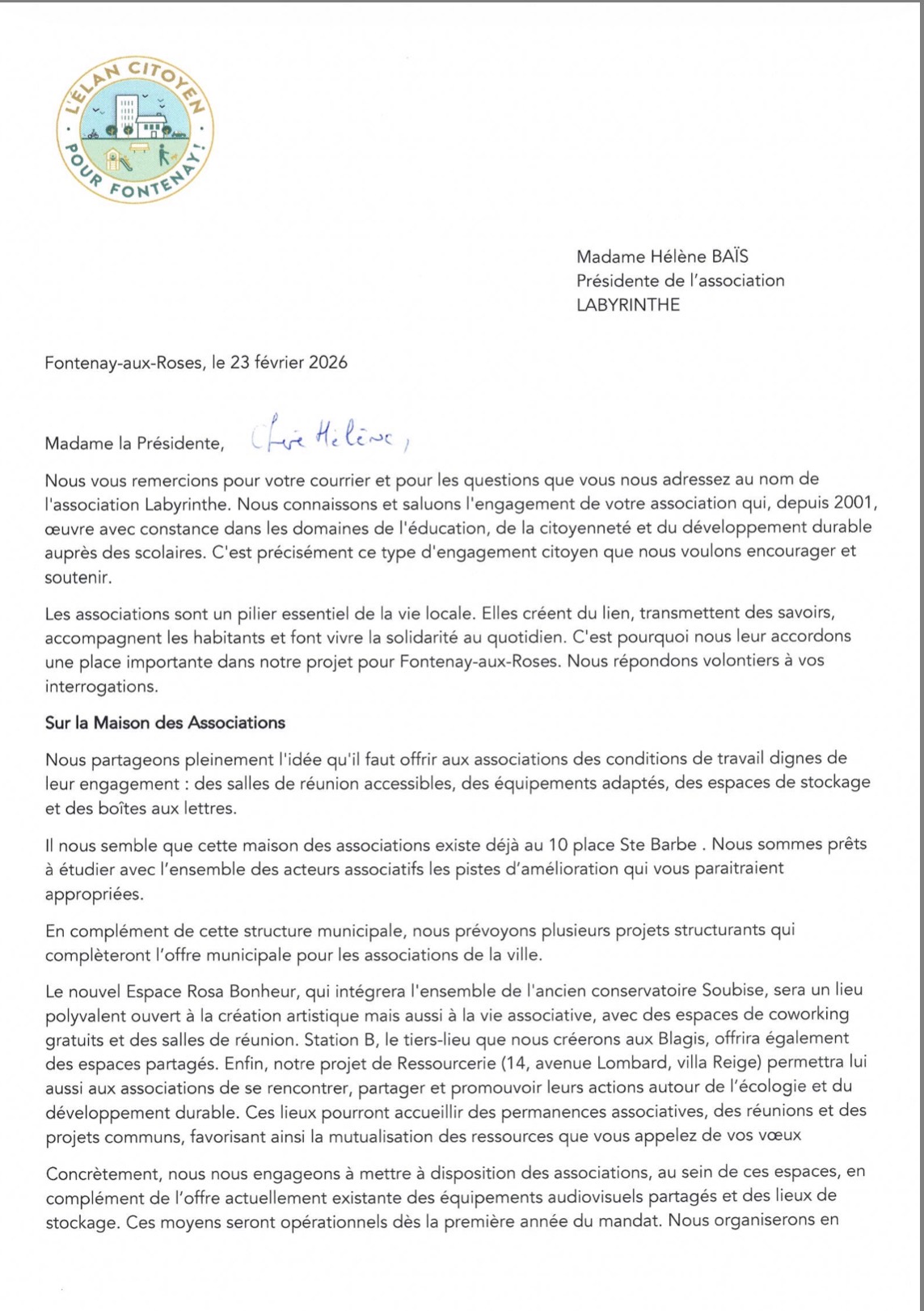 Questionnaire de l’association LABYRINTHE : réponses de la Liste L’Elan Citoyen pour Fontenay !
