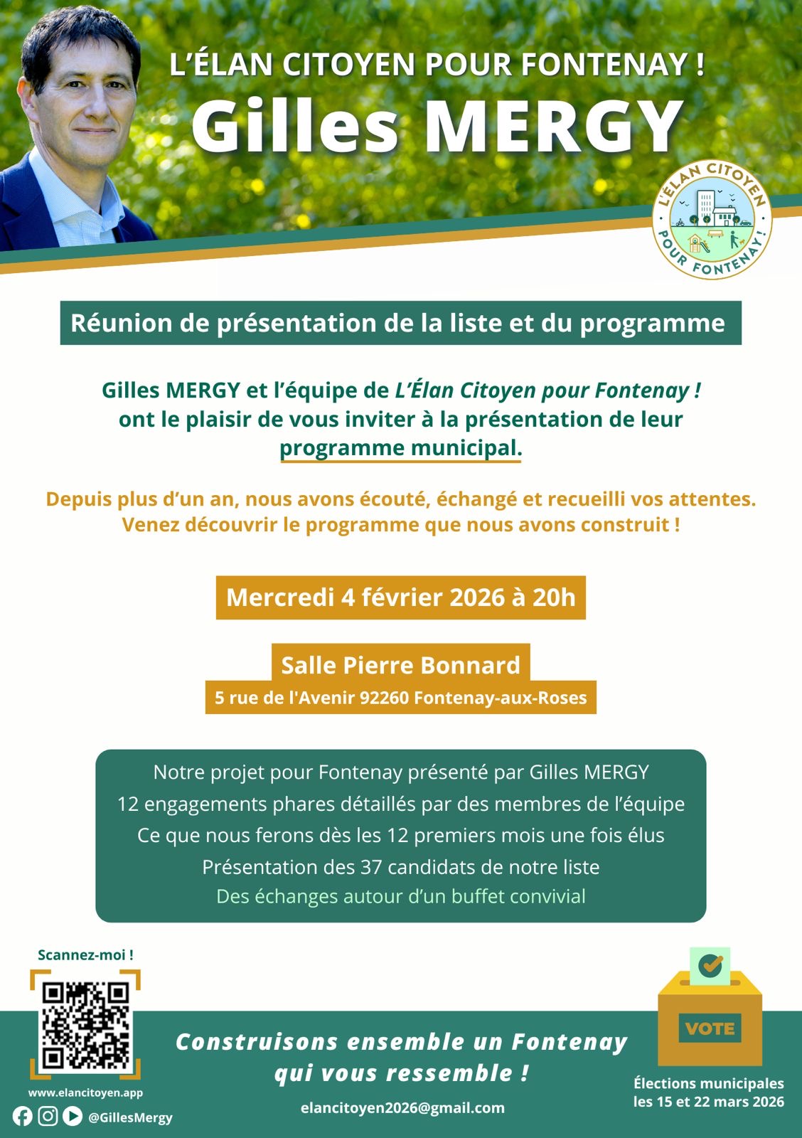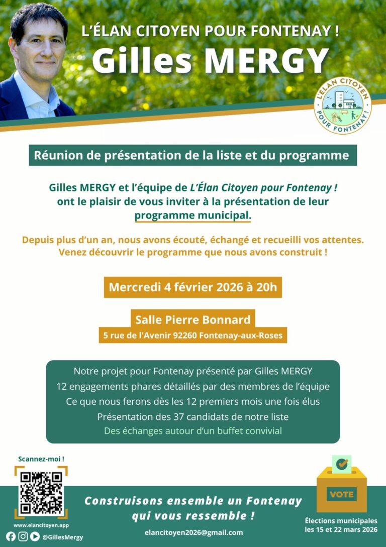 Le 4 février 2026, nous vous présenterons notre projet municipal pour Fontenay-aux-Roses et l’équipe de l’élan citoyen qui se présentera à vos suffrages les 15 et 22 mars prochain.